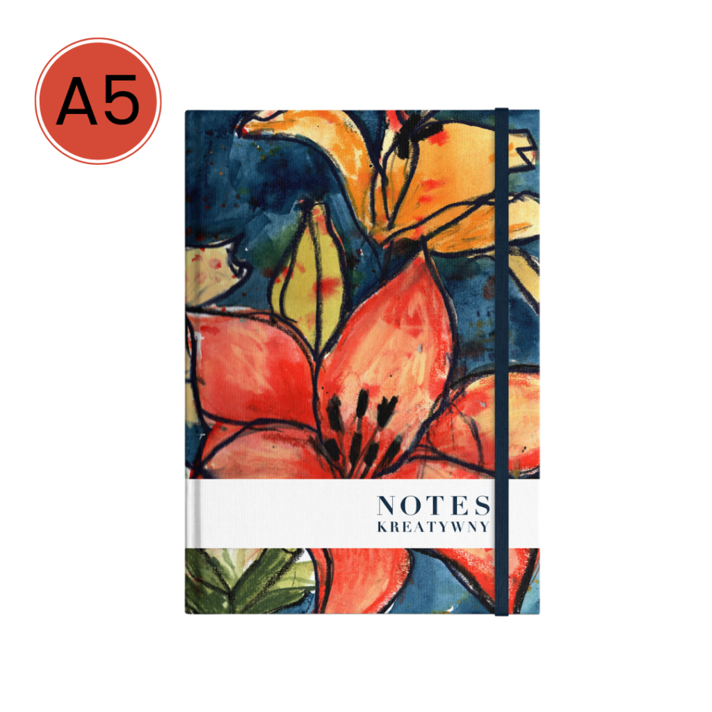Na okładce tego notesu znajdziesz lilie z mojego ogrodu, te widziane o zmroku, zanurzone w miękkiej, wyciszającej poświacie, gdy mój kaszubski ogród powoli zapada w sen. To czas ukojenia, domknięcia dnia i wsłuchania się w siebie. To chwila na wieczorne podsumowania i kojące myśli, które przychodzą dopiero wtedy, gdy wszystko dookoła zwalnia i możesz oddać się temu, co lubisz najbardziej. Oczywiście, możesz w nim malować o każdej porze dnia i nocy. Obiecuję, że nie będę tego kontrolować 😉